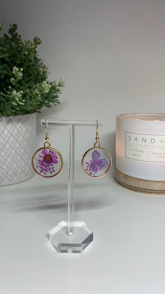 Resin Framed Earrings - With Dried Purple Flowers in Silver or Gold Frames