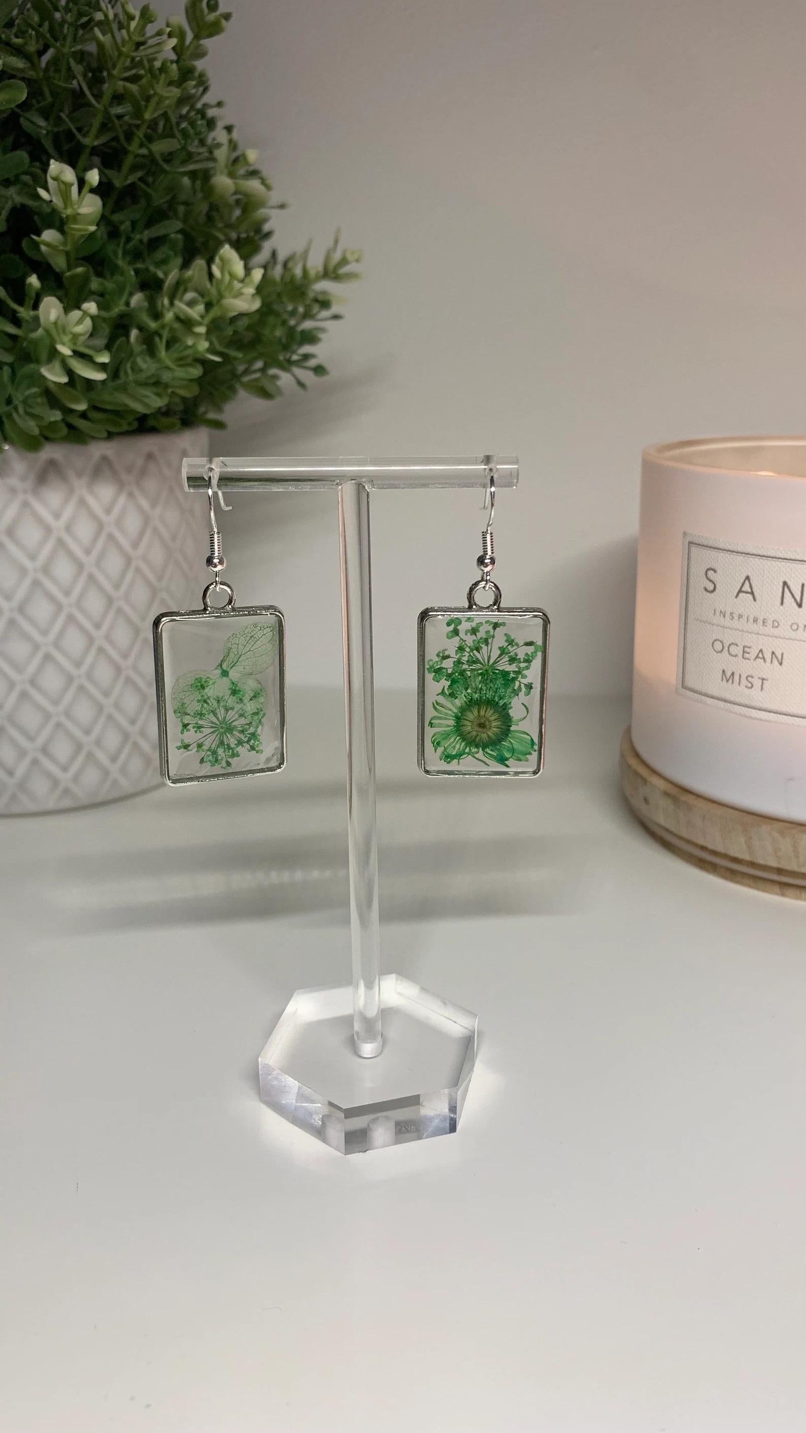 Resin Framed Earrings - With Dried Green Flowers in Silver or Gold Frames