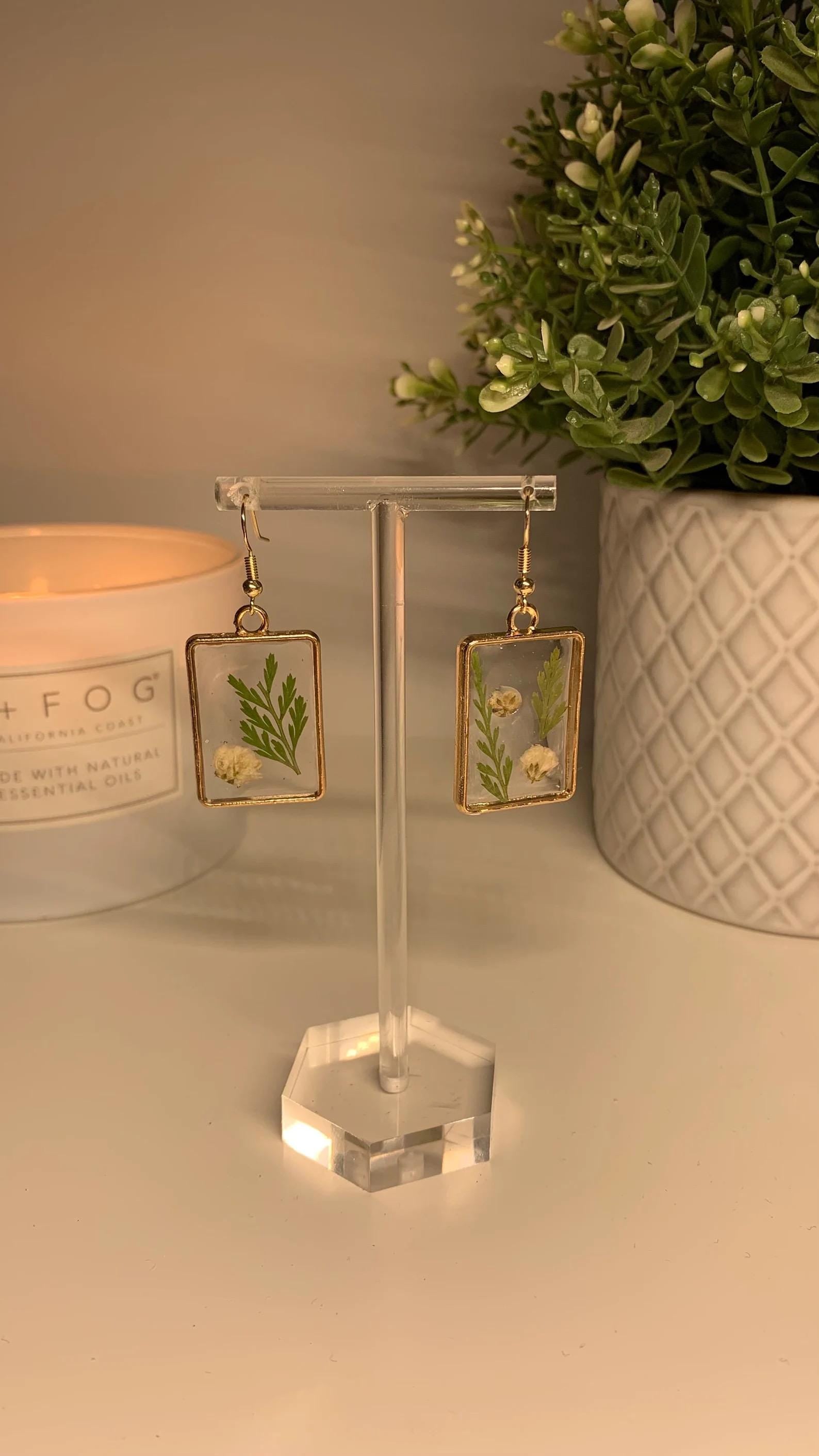 Resin Framed Earrings - With Dried White Flowers and Foliage in Silver or Gold Frames